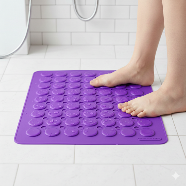PVC with massage nodes provides reflexology benefits while showering. Suction cup backing for safety. Material: PVC with raised massage nodes. Colour: Clear, Green, Blue, Purple. Sizes: 16×28 inch. Care: Rinse and hang after use. Clean weekly. Features: Reflexology massage nodes, suction cup backing, drainage design, therapeutic benefits. Stimulates feet while providing safety. Perfect for wellness-focused bathrooms. Made in India.