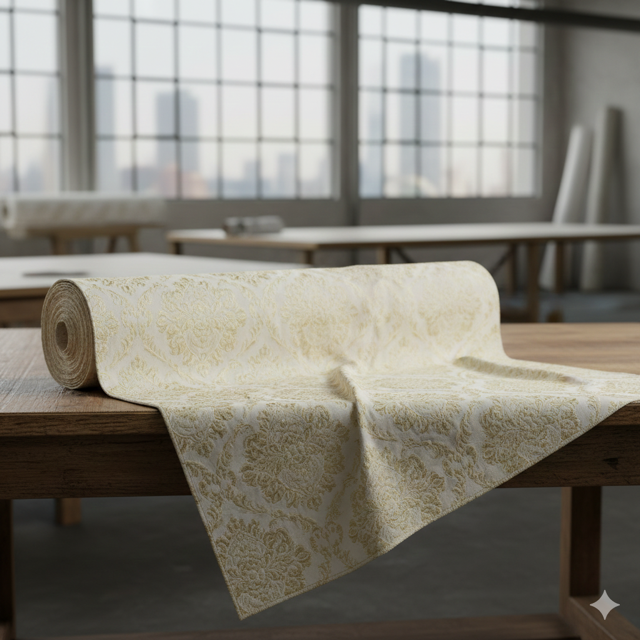 Polyester jacquard damask 280 GSM with raised floral medallion patterns. Formal elegance with durability. Material: Polyester jacquard damask. Colour: Ivory Gold, Burgundy, Navy Blue, Emerald. Sizes: Per meter (54 inch width). Care: Dry clean recommended. Vacuum with upholstery attachment. Avoid direct sunlight. Durability: Pattern-woven for longevity, formal appearance. Usage: Traditional furniture, formal living rooms, statement pieces. Manufactured in India.