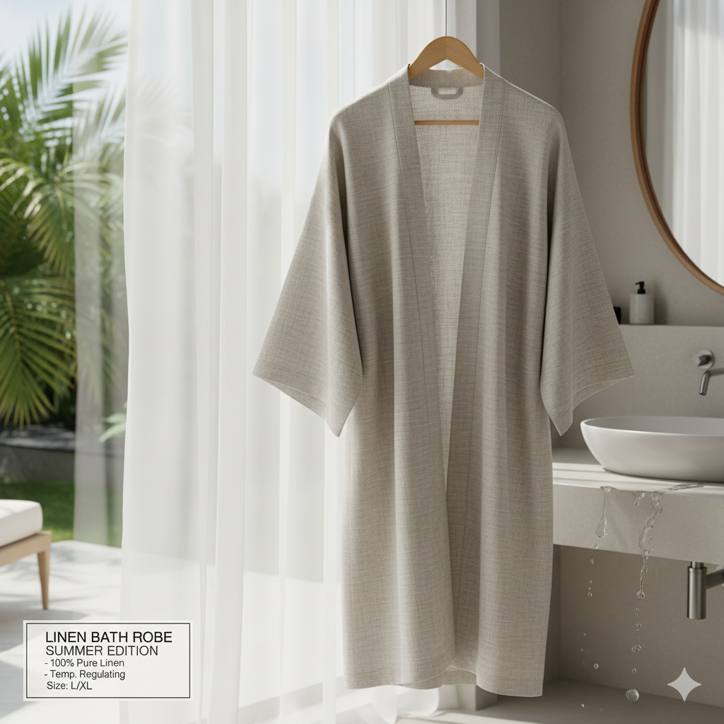 Breathable pure linen bath robe 250 GSM ideal for hot climates and warm seasons. Features lightweight linen, natural temperature regulation, and elegant simplicity. Material: 100% pure linen. Colour: Beige. Sizes: L. Care: Machine wash warm gentle cycle. Lay flat to dry. Light iron possible. Properties: Extremely breathable, naturally temperature-regulating, durable linen construction. Perfect for tropical climates, summer homes. Made in India.