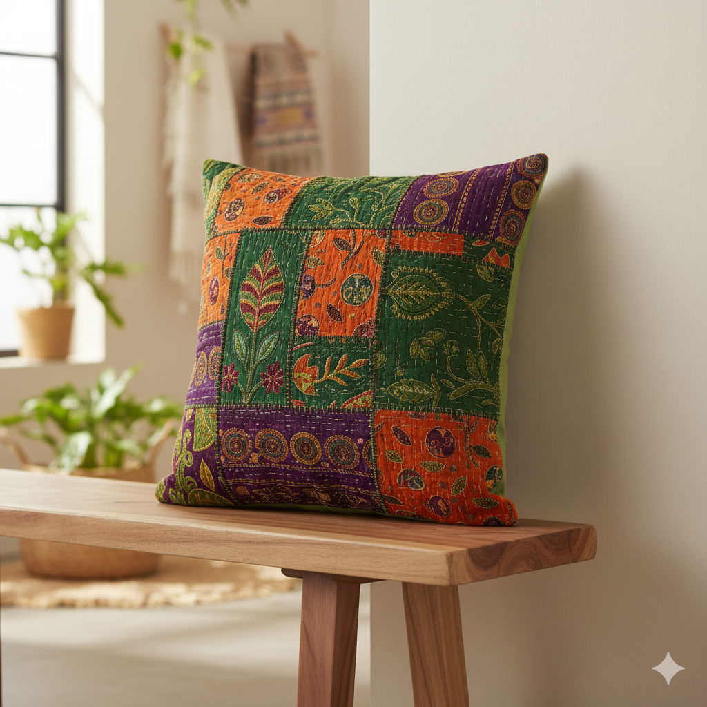 Creative patchwork cotton cushion 200 GSM featuring traditional appliqué technique with color blocking and diverse fabric combinations. Features handcrafted patchwork design, unique patterns, zip closure. Material: 100% cotton patchwork with appliqué. Design: Hand-appliquéd patchwork patterns. Colour: Green-Orange-Purple mix. Sizes: 20×20 inch. Care: Gentle hand wash only in cold water. Do not machine wash. Air dry flat. Design: Each piece unique with handcrafted appliqué. Perfect for eclectic, bohemian, and artistic spaces. Made in India.