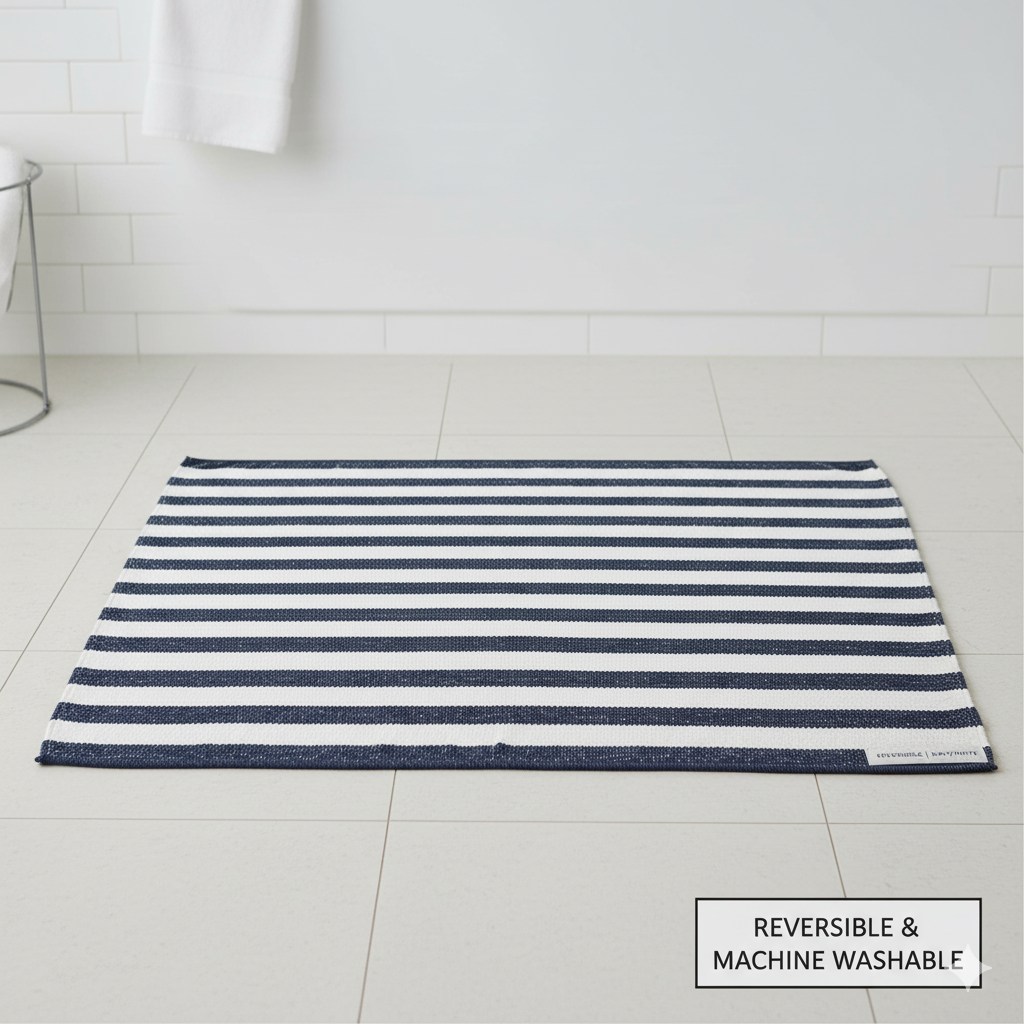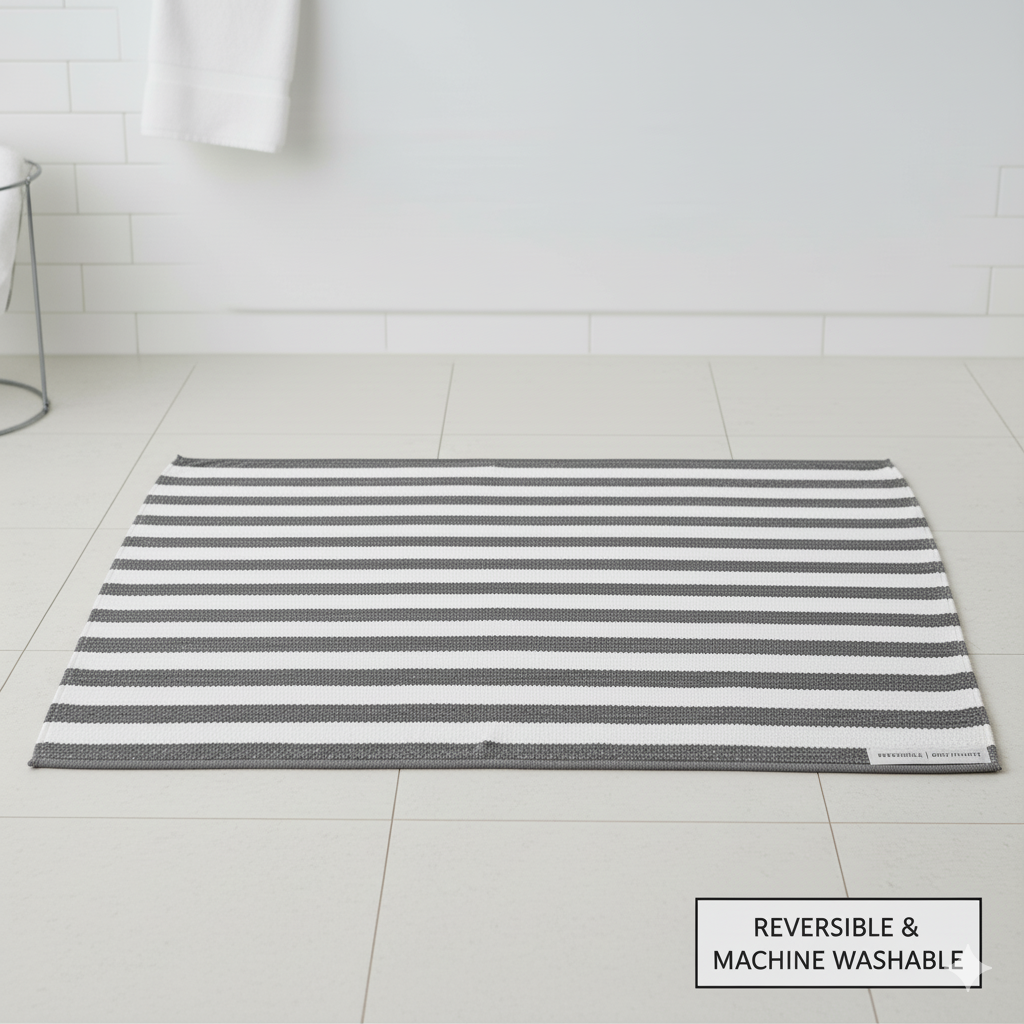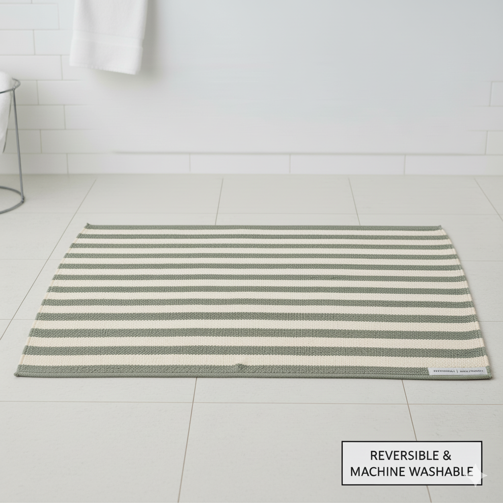 100% cotton 300 GSM with reversible design, different colors on each side. Machine washable, durable construction. Material: 100% cotton. Colour combinations: Navy/White, Grey/Charcoal, Sage/Cream, Coral/Peach. Sizes: 20×34 inch. Care: Machine wash cold. Tumble dry low. Reverse sides for even wear. Properties: Reversible extends life, absorbent, soft, machine washable. Perfect for kids’ bathrooms, guest baths, frequent washing. Manufactured in India.