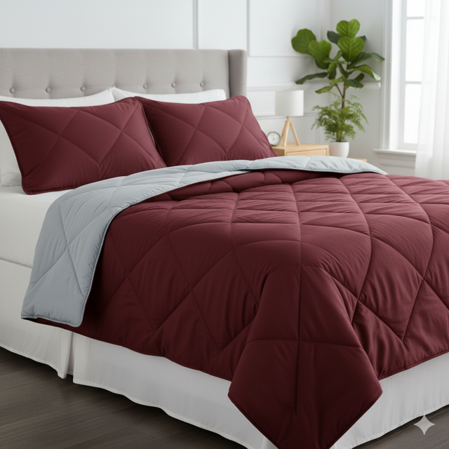Cotton-polyester blend 220 GSM, reversible with two-sided design. Features diamond quilting pattern, machine stitched. Material: Cotton-polyester blend. Colour: Teal Blue, Maroon, Olive, Mustard. Sizes: Double bed (90×100 inch). Care: Machine wash warm 40C. Gentle cycle. Tumble dry low or line dry. No bleaching. Iron on low if needed. Quilting: Diamond pattern throughout, ensures even insulation. Versatile: Reversible design, extends usability. Made in India.