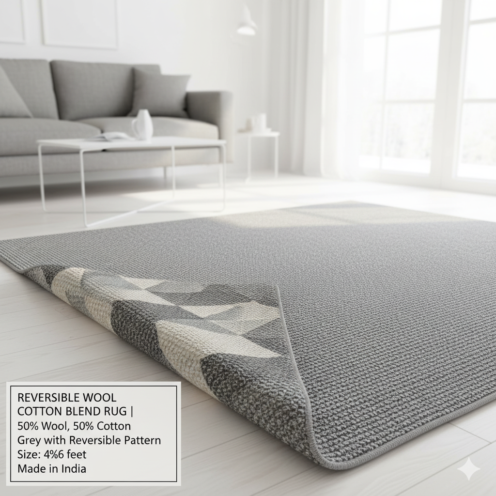 Clever reversible wool-cotton blend rug 200 GSM with two different patterns—one on each side for extended use. Features dual-sided design, balanced weight, and practical construction. Material: 50% wool, 50% cotton blend. Pattern: Different pattern on each side for reversibility. Colour: Grey-side with texture. Sizes: 4×6 feet. Care: Rotate regularly to wear both sides evenly. Vacuum with brush. Spot clean with water and mild soap. Professional cleaning optional. Design: Reversible extends rug life significantly. Perfect for practical families, budget-conscious buyers. Made in India.