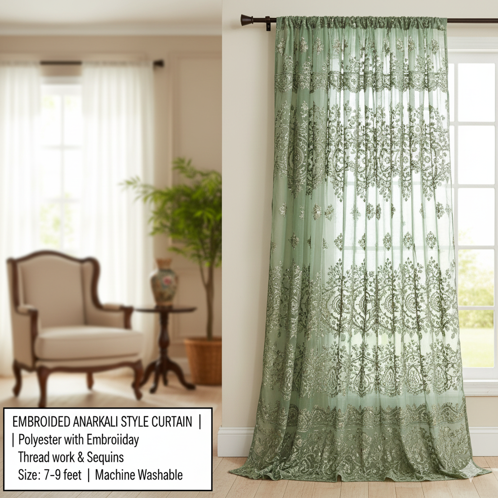 Premium silk taffeta 120 GSM with shimmering iridescent finish that changes appearance with light and movement. Features sophisticated iridescent quality, grommet top heading, and structured drape. Material: 100% silk taffeta. Colour: Champagne-Copper. Sizes: 7-9 feet. Care: Dry clean only recommended. Gentle hand wash possible in cold water only. Line dry. Do not iron. Finish: Iridescent coating creates color-changing effect. Perfect for formal living rooms, home theaters, luxurious bedrooms. Manufactured in India.