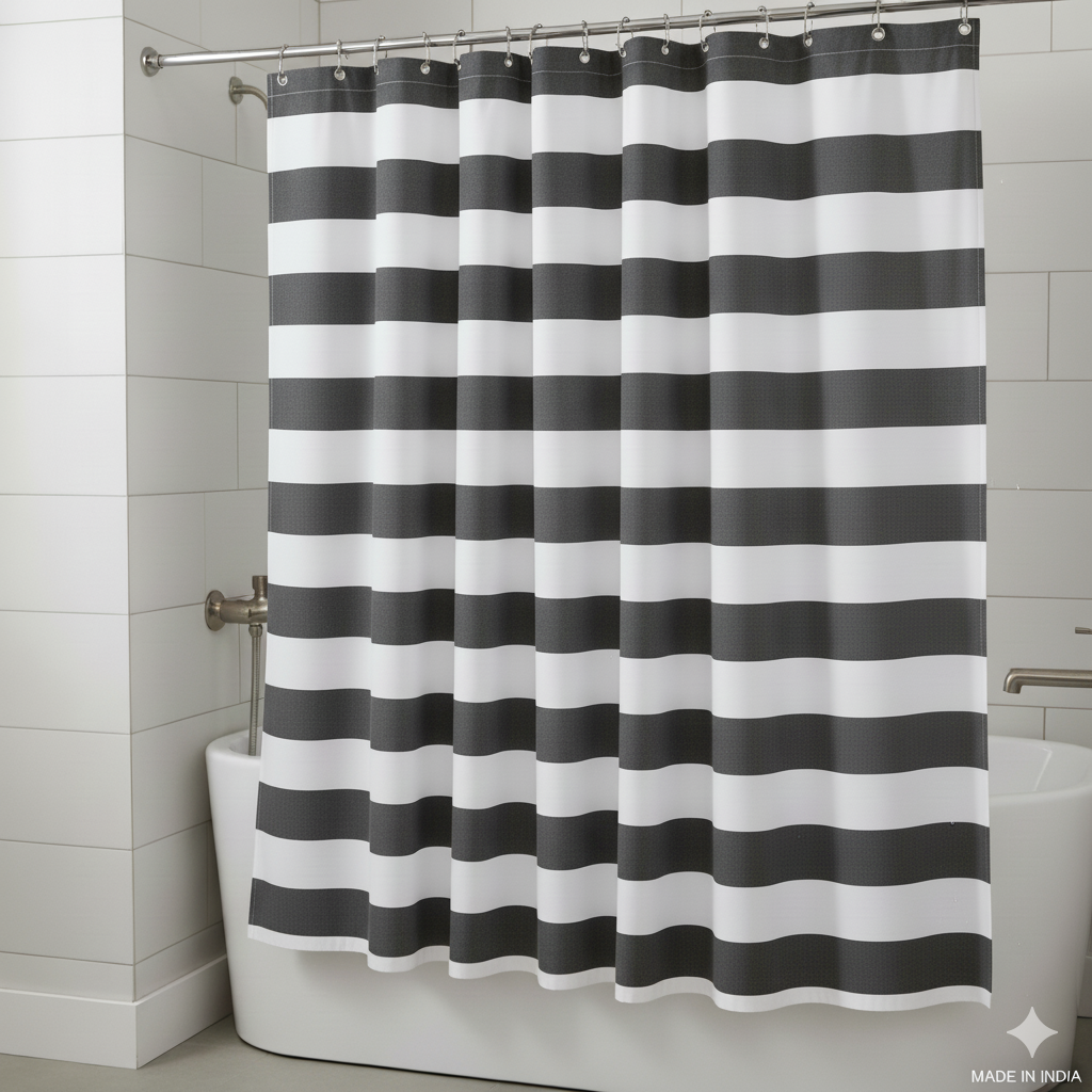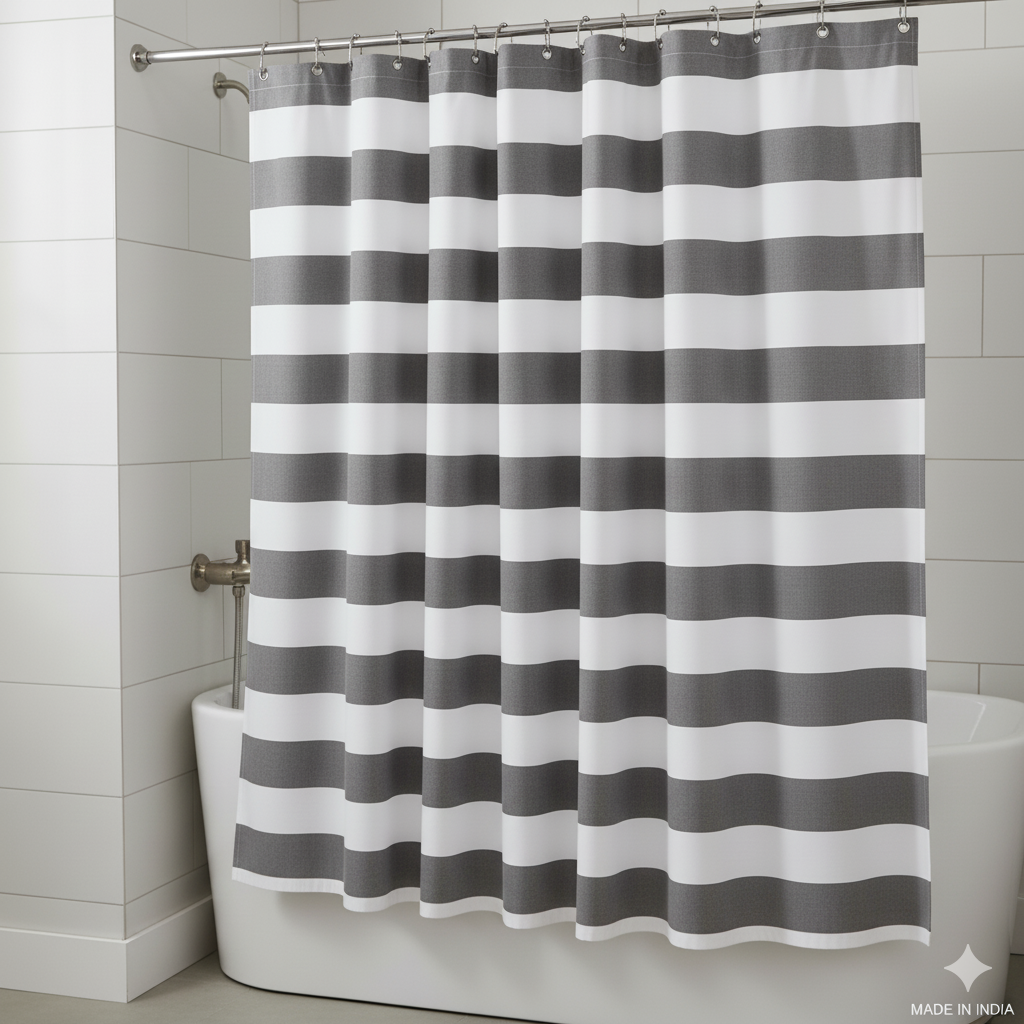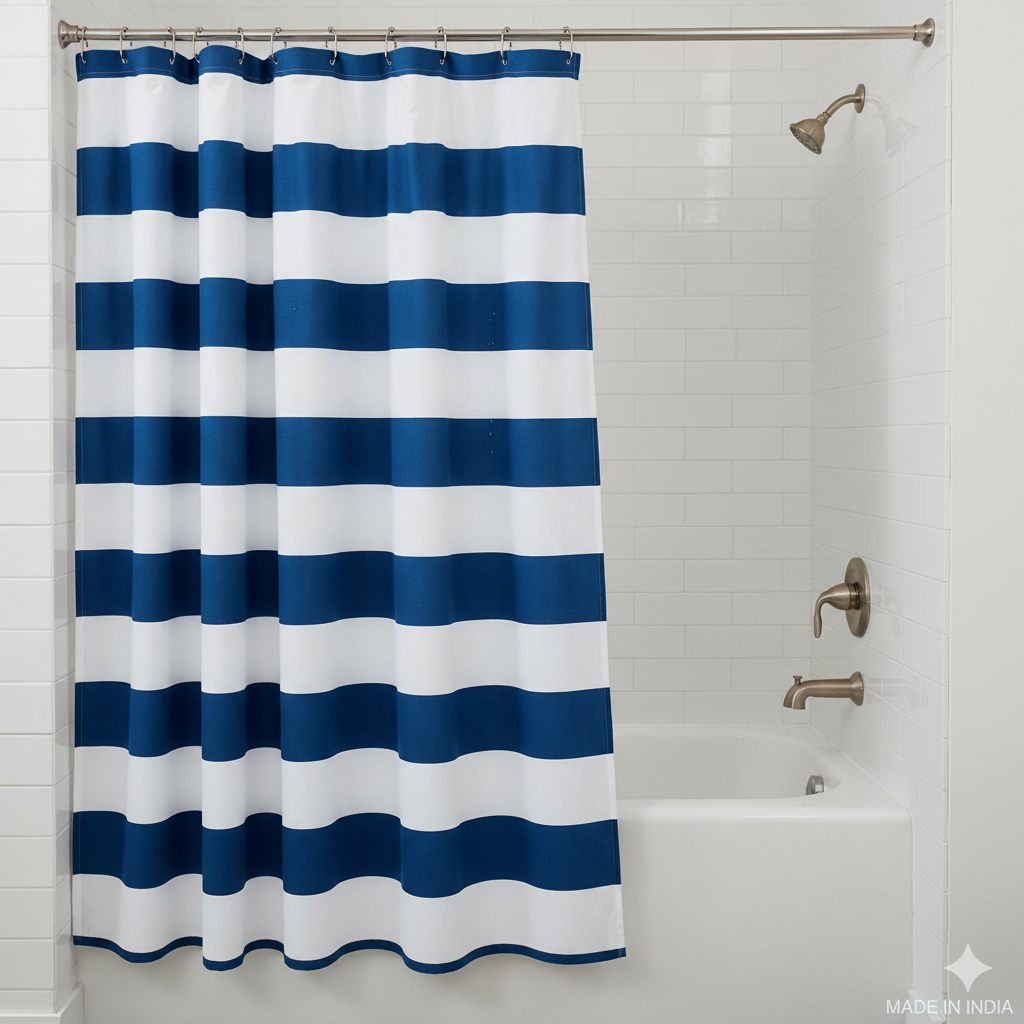 Cotton-canvas blend 200 GSM with timeless horizontal stripes. Heavy-weight construction, machine washable. Material: Cotton-canvas blend. Colour: Navy-White, Grey-White, Black-White, Blue-White. Sizes: Standard 72×72 inch. Care: Machine wash cold. Line dry preferred. Iron if needed. Features: Reinforced button holes, weighted hem. Requires liner. Classic nautical style perfect for coastal bathrooms. Manufactured in India.